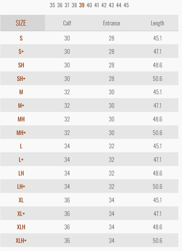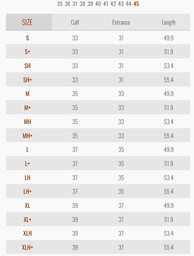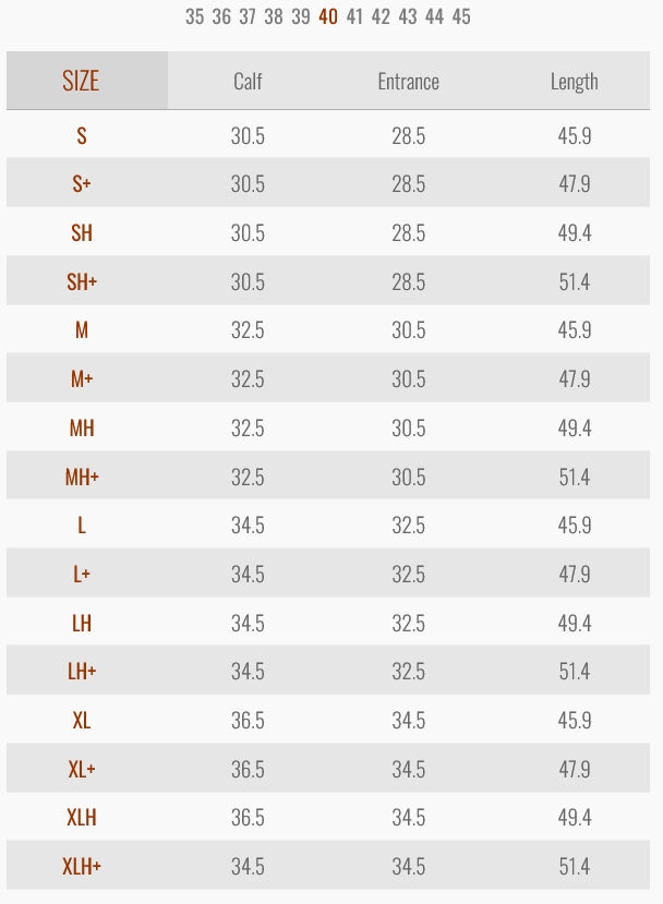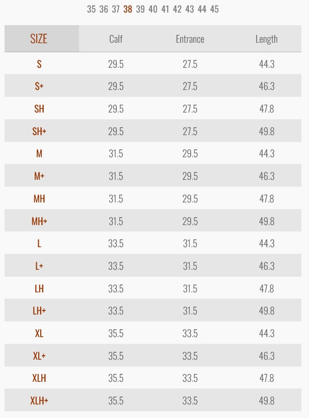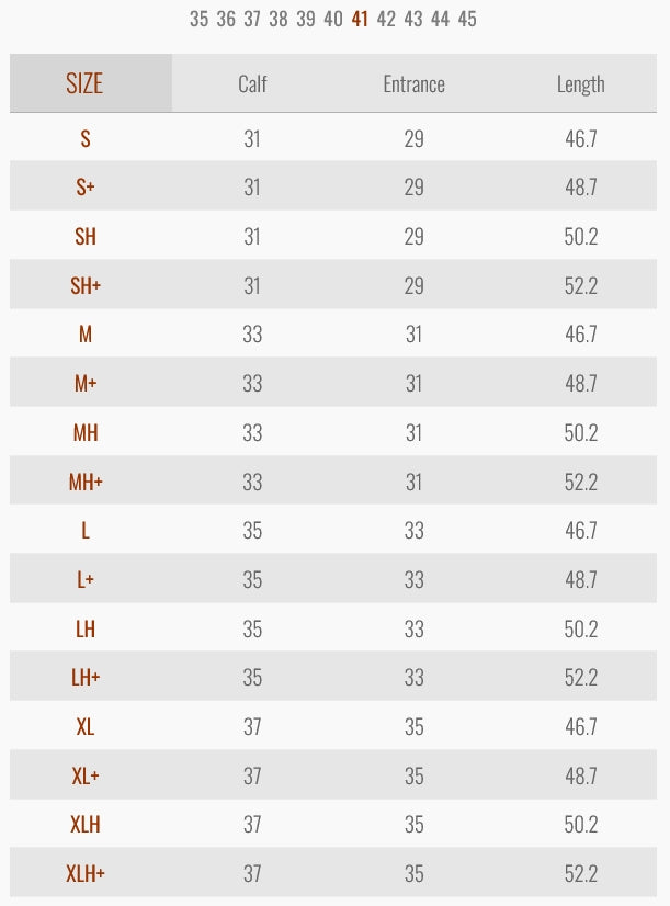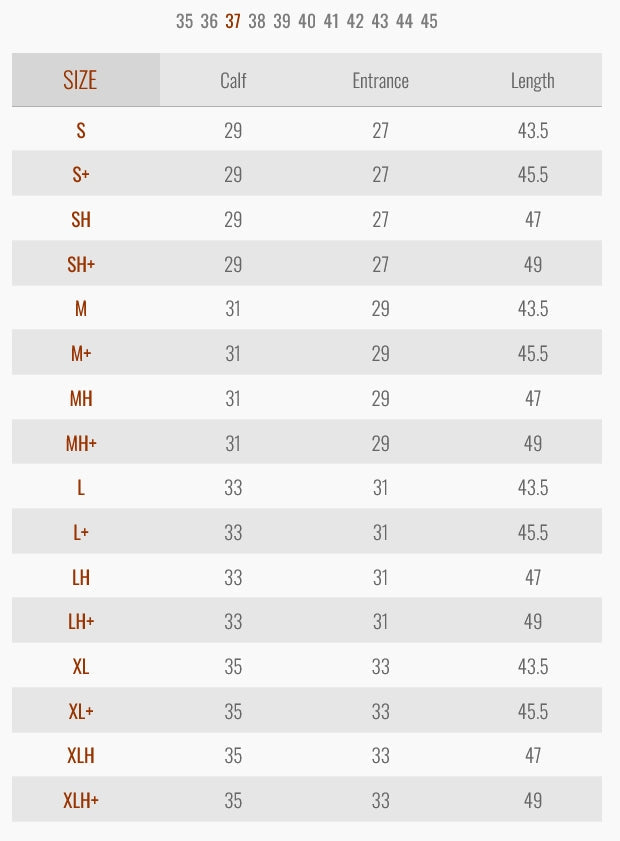 We are happy to help you determine the correct calf size. View this explanation to determine the size and then look in the size chart for the correct size. Contact us without obligation or come and try on the boots in our store.
