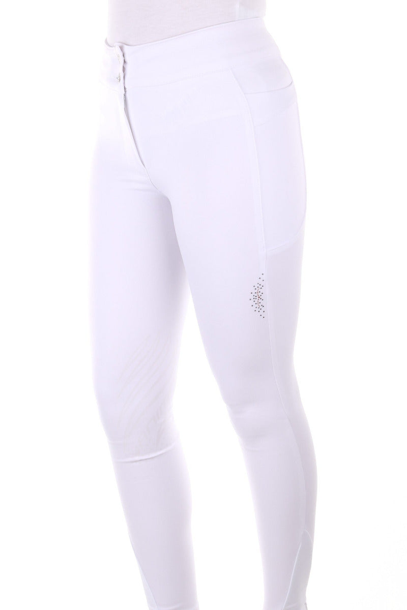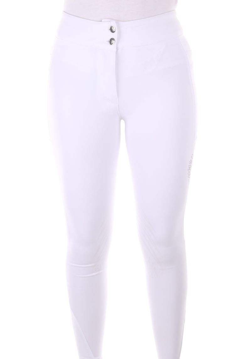 High waisted women's trousers with knee grip, made of Esprit fabric. The waist has a double button closure. The silicone strip inside the waistband keeps the shirt tucked in. Items made of Esprit fabric fit like a second skin, which ensures breathability and natural regulation of body temperature. The close-fitting fit enhances the silhouette. Push-up effect. Albatross logo in rhinestones on the left leg. "Effortlessly Innovative" design.