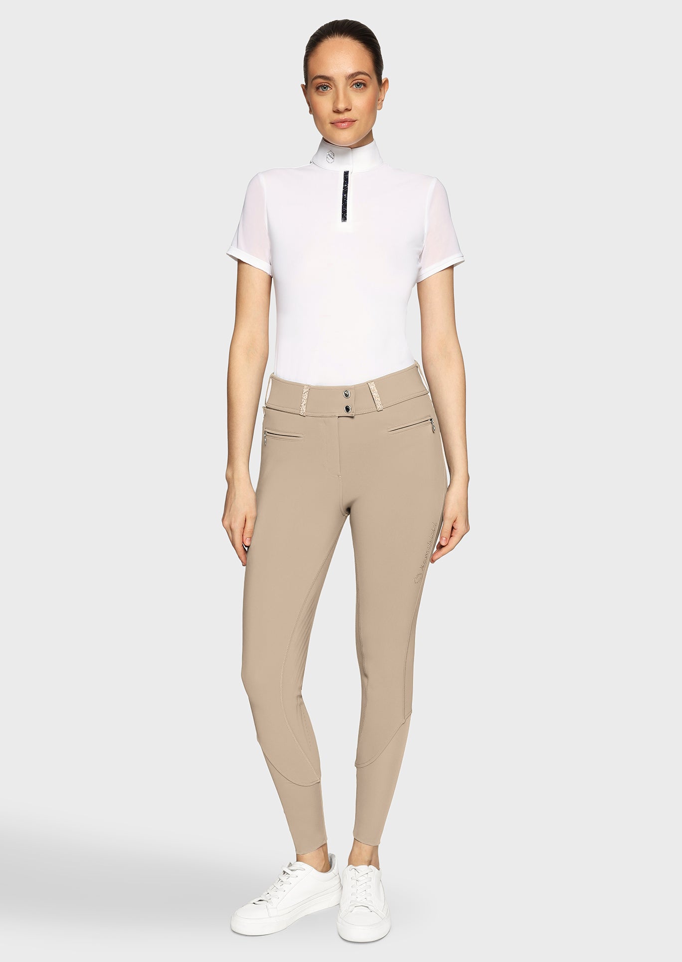 The breeches are made from high-quality Italian technical fabric that is breathable, stretchy and durable. This ensures long-lasting comfort, even during demanding training sessions or competition days. Luxury details such as the Swarovski Crystal Fabric accents on the belt loops and back pockets give the breeches a subtle and elegant look. The signature Samshield pleats at the back enhance the refined design.