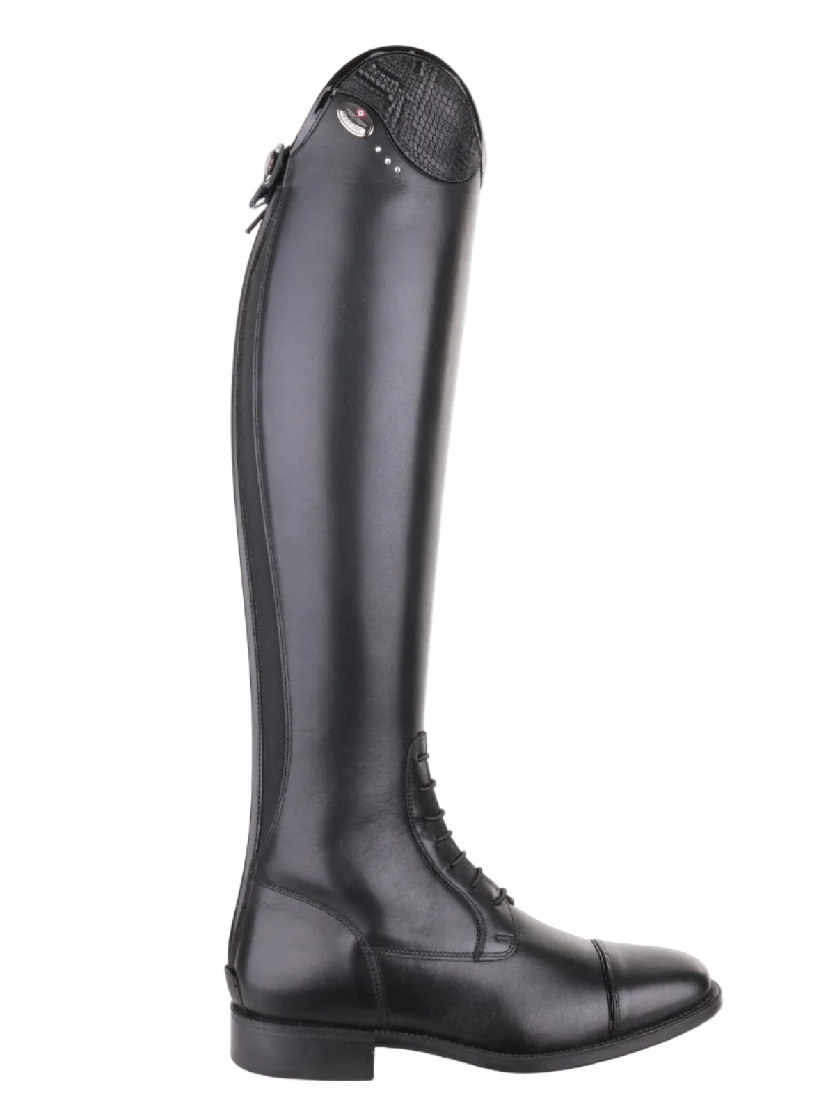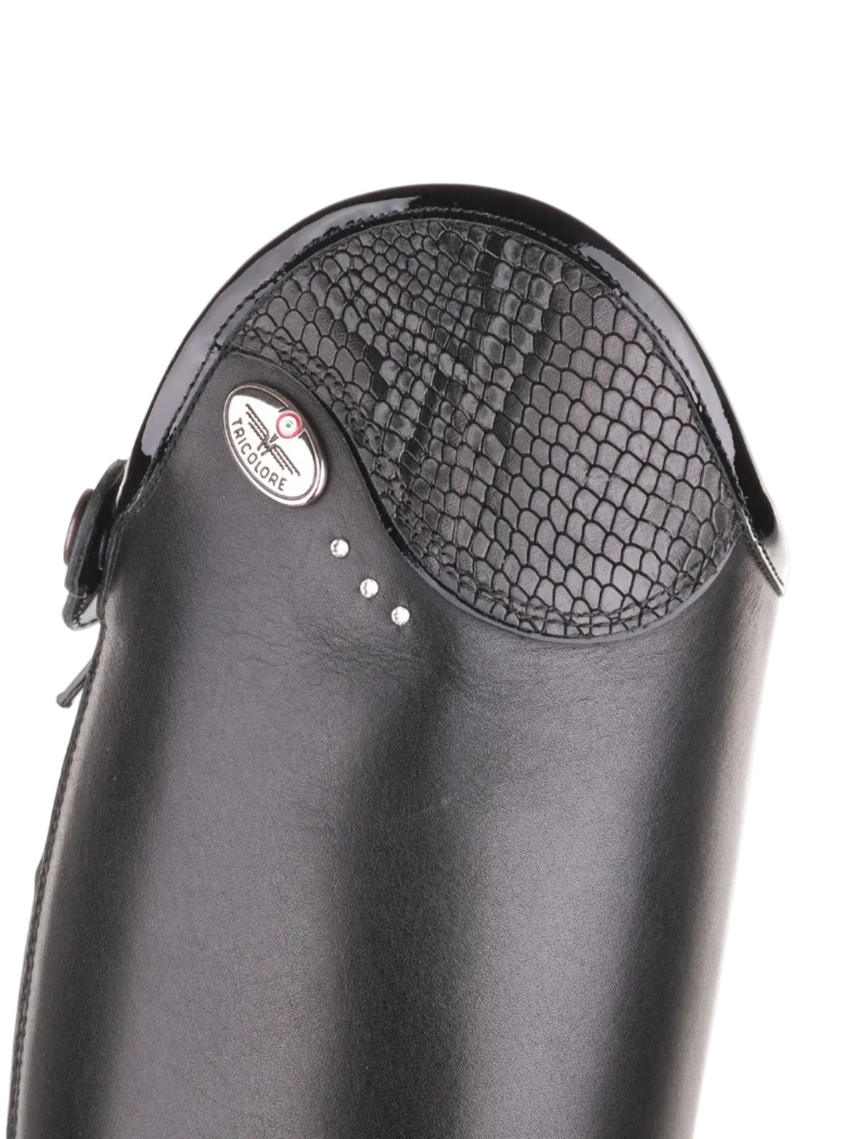 The Tricolore Salentino Custom Smooth Black riding boots are an elegant and refined custom version with great attention to detail. These boots are crafted from Smooth Black leather (Salentino/02), offering a timeless and sleek appearance. The Patent Black pipings add a subtle glossy accent along the lines of the boot, while the Glitter Black top and SW Crystal details provide a luxurious and stylish finish.