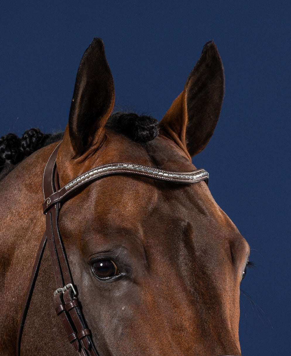 V-shaped browband with silver clinchers from the top brand Dy'on. Striking about this browband are the refined design and decorative stitching. The browband is softly padded and matches the bridles of the US Jumping Collection line.