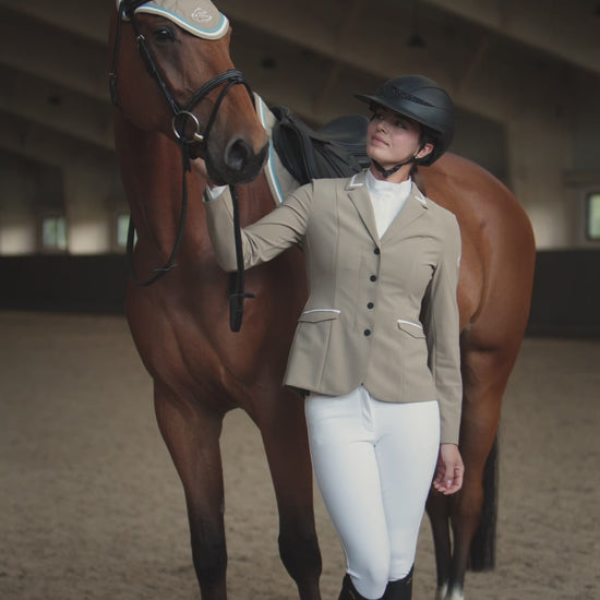 Stretchy and breathable women’s competition jacket featuring Equiline micro laser panels for enhanced ventilation. The back is finished with two vents. The jacket is unlined, making it easy to care for and light and airy to wear.