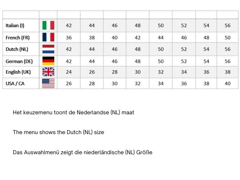 - Size: EU40 - NL46 | EU42 - NL48 | EU44 - NL50 | EU46 - NL52. Choose the Dutch (NL) size in our menu.