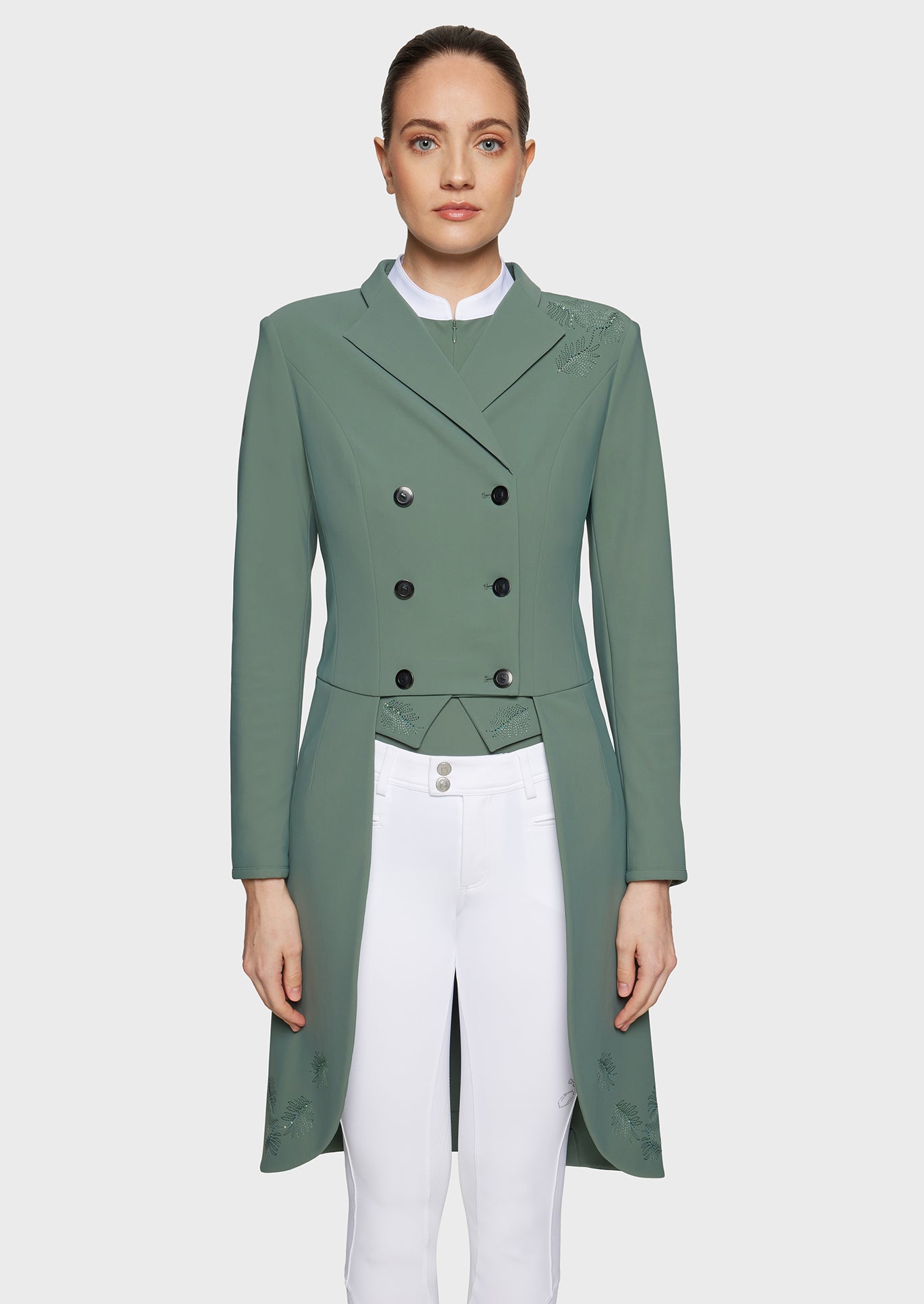 The Samshield Crystal Ferna women’s tailcoat combines elegance, performance and refinement in an exclusive competition jacket designed for the dressage arena. This high-end frac reinvents the classic design with a luxurious look that perfectly suits prestigious competitions. The embroidered Ferna motif, subtly enhanced with Swarovski® crystals, adds a refined and luminous touch.