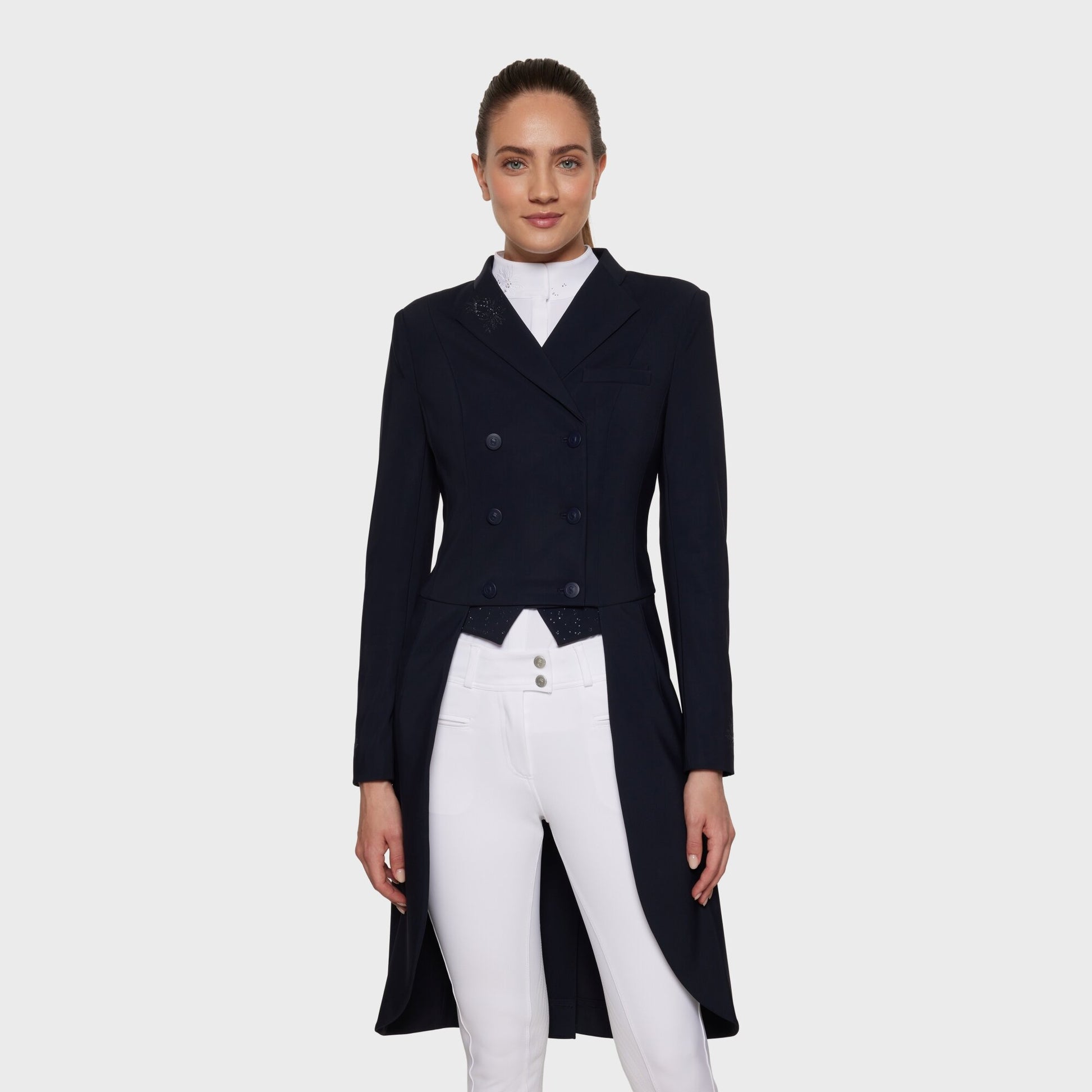 Crystal Fabric Dressage tail coat has been made from highly breathable, elastic, lightweight and durable technical fabric for best comfort. The tail coat’s inside has been made from elastic fabric and mesh material to ensure excellent air exchange without limiting the mobility. Tail coat Crystal Fabric has been adorned with Stunning 'Ultra Fine Rock' Swarovski décor