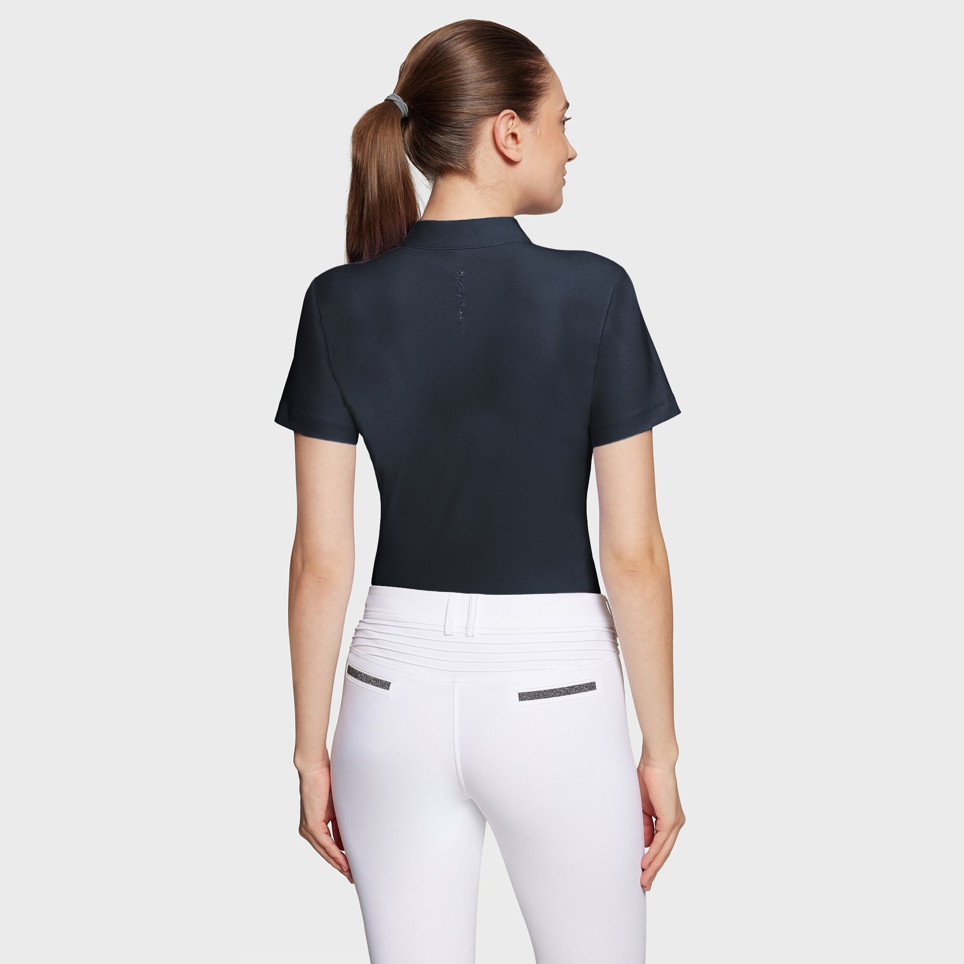 Its innovative composition maintains a lightweight feel while exuding a polished appearance. The shirt features subtle Samshield logo detailing on the collar and a Swarovski Crystal Fabric framed zipper, all contributing to its refined aesthetic.
