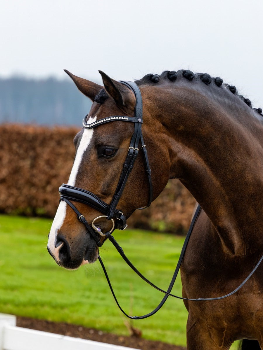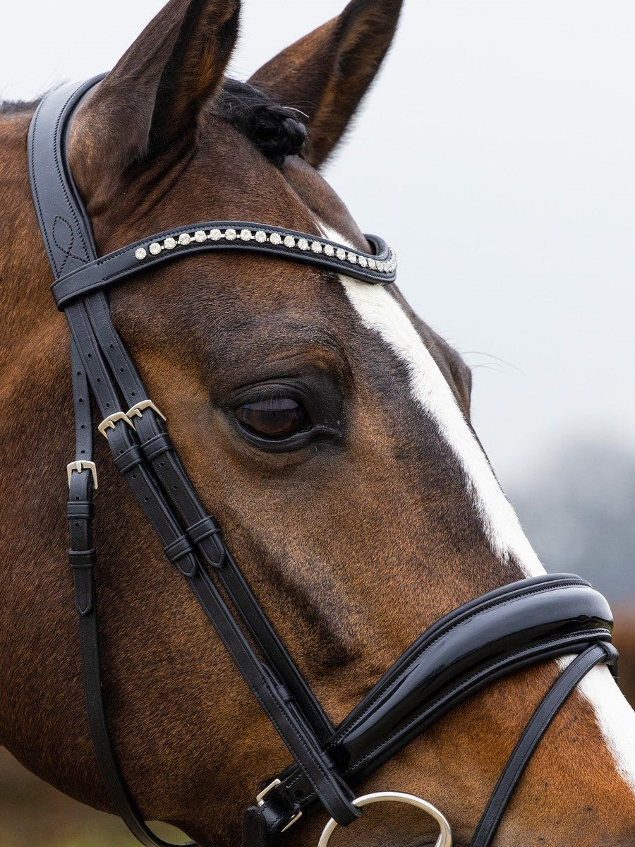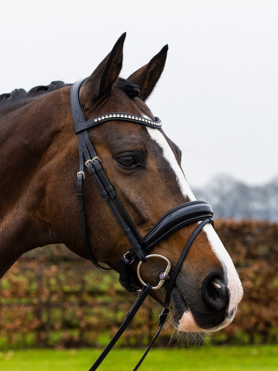 The dressage bridle TRUST Rotterdam is a beautiful bridle with a wide patent leather noseband. The noseband has a super soft padding for extra comfort. The noseband is padded with nylon. This prevents the noseband from stretching and keeps the fit perfect. The ends of the noseband are narrowed, which provides more freedom with the bit. The noseband also rises in the middle. This makes the noseband double anatomical. In addition, the flash strap has a buckle protector so that the buckle never touches the nose of the horse. The browband is fitted with the purest quality Stellux™ stones, which gives it an elegant look. These stones are deep-set, so they do not fall out. The browband is also slightly curved. The headpiece is anatomically shaped and cut back for more freedom at the ears. The padding of the headpiece is soft but not too thick so that there is direct contact with the horse.