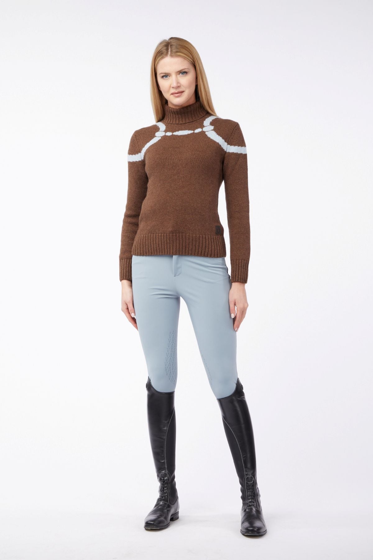 - Knitted horse bit print on the front
